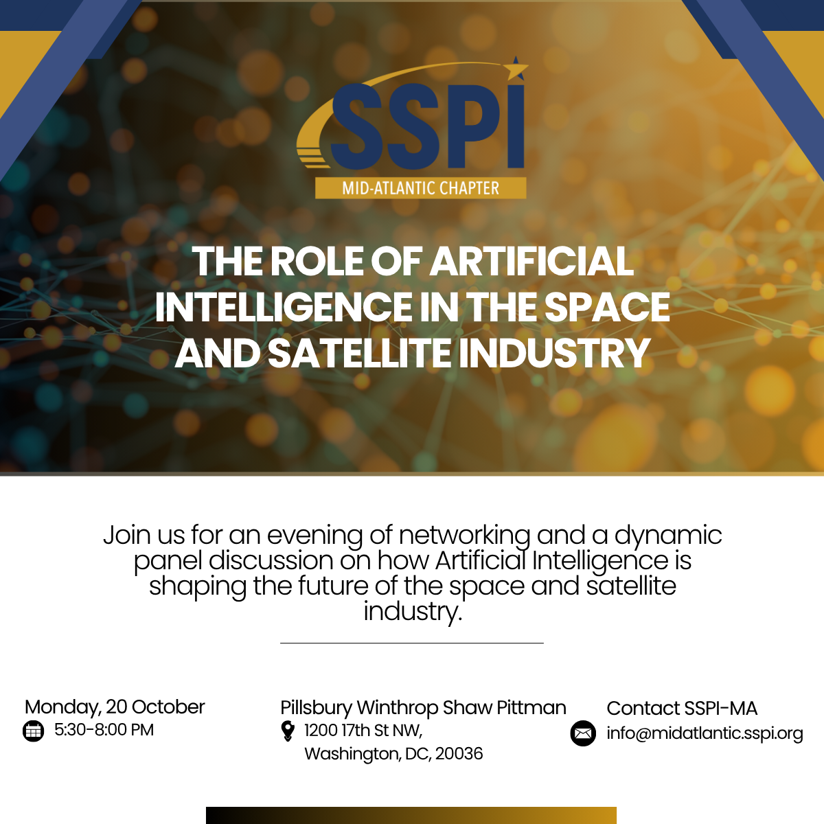 The SSPI Mid-Atlantic Chapter boasts an energetic and active chapter, with educational and networking events throughout the year. These events support our scholarship activities, allowing the Chapter to award more than $173,000 to space and satellite related educational programs and area university students over the past 14 years.